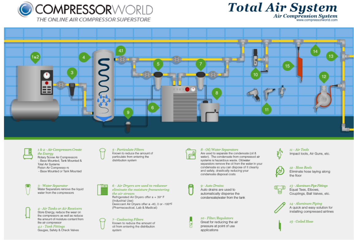 Don't forget your air tank. It's recommended to have a minimum of 2 gallons of storage when sizing vfd air compressors, the more storage you have, the better. Compressor World has a large selection of VFD air compressors. Call 866.778.6572 to get an experts opinion. Our staff has over 50 years experience in sizing air compressors. If you have any questions on the components you should have in a total air system, review this infographic for tips and descriptions.