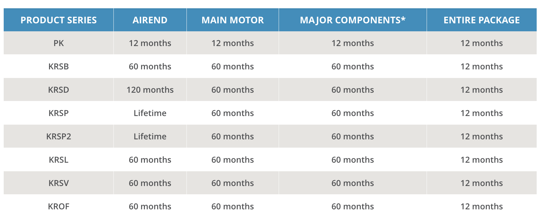 - Compressors that qualify for Lifetime Airend Warranty; Parts and Labor are covered for first 120 months from the start-up or 126 months from the shipment from KCA, whichever occurs first. Parts only warranty thereafter.